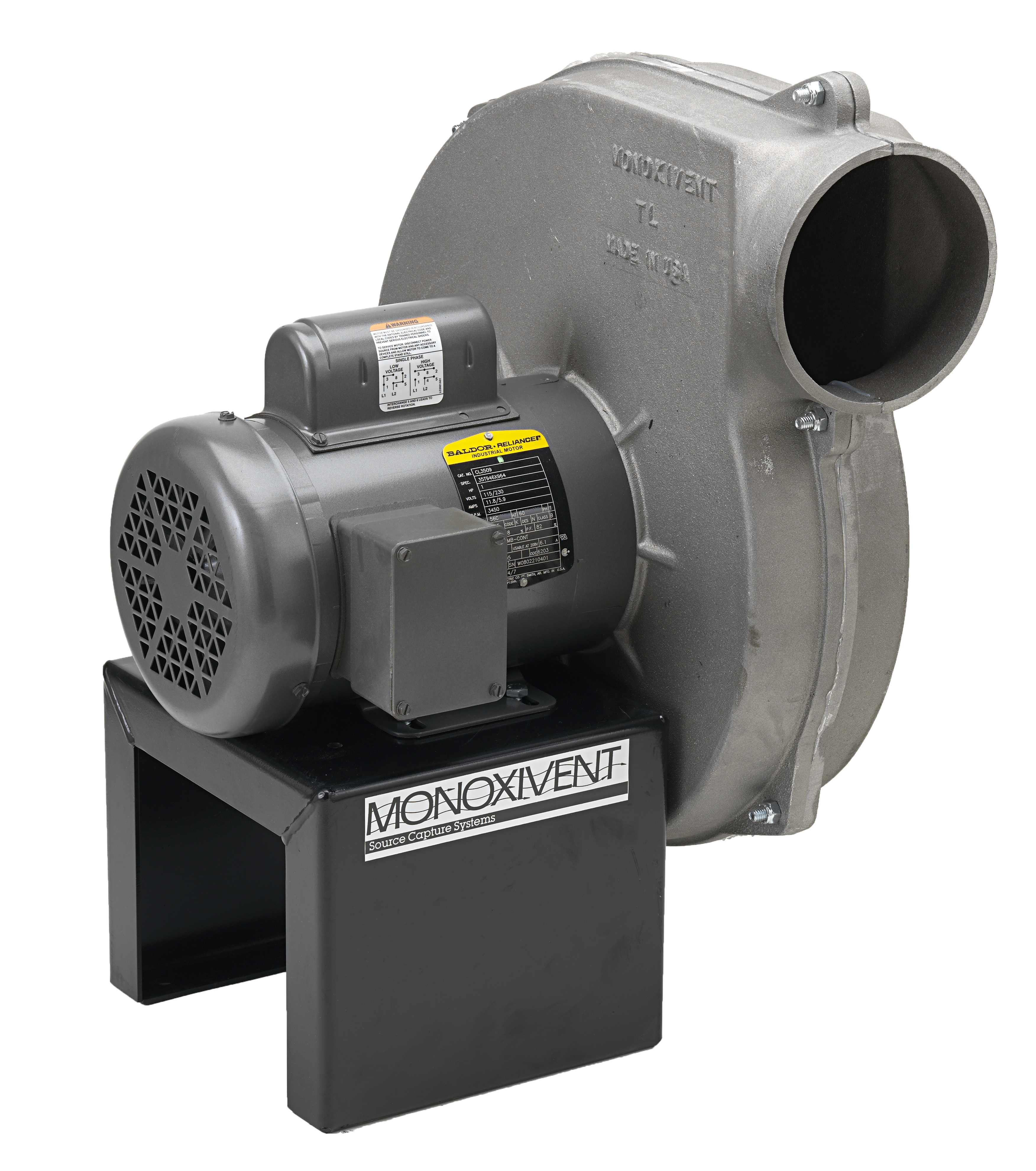 Monoxivent’s D Series fan is a direct drive, radial blade type blower. The housing and wheel are constructed of cast aluminum. The standard motor configuration is TEFC, however other motor options are available. Wall mount brackets are standard or the D Series may be configured to connect directly to a hose reel or welding arm.
