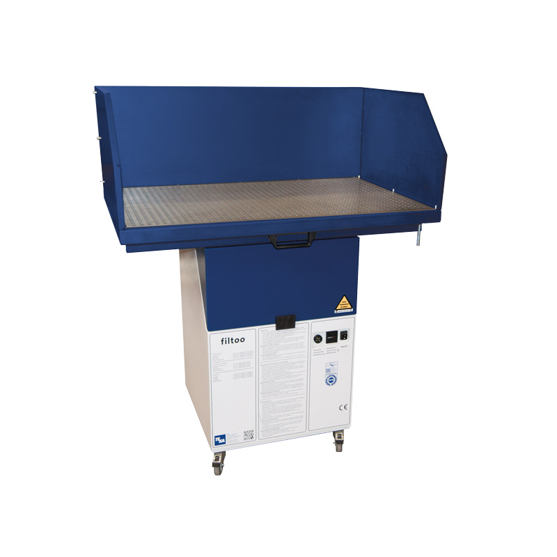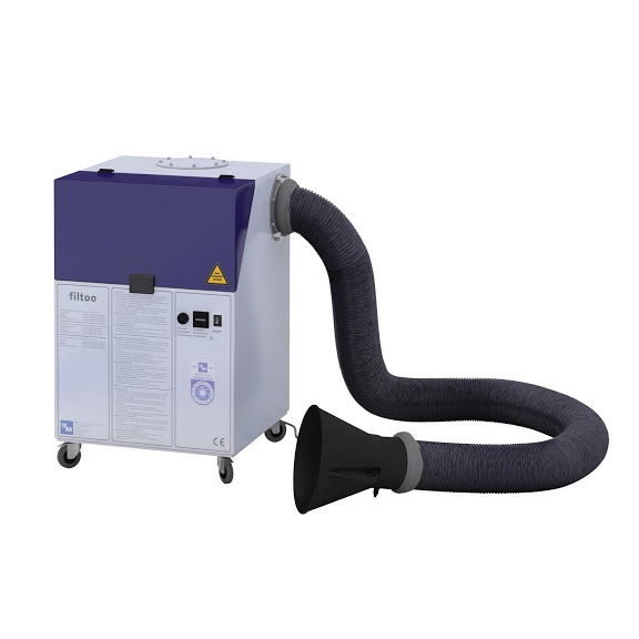 The Filtoo is a mobile filter unit that can be used for many applications requiring the filtration of fumes, dust, and even gases. The polluted air is extracted and directed into the filter unit by either a self-supporting suction arm, downdraft table or suction hose. The offending dust, fumes and/or particulate are removed from the airstream through several stages of filtration and the clean air is then returned to the work space. The Filtoo is a plug and play system that is ready for operation. It is only necessary to connect the intake elements before commissioning the unit.