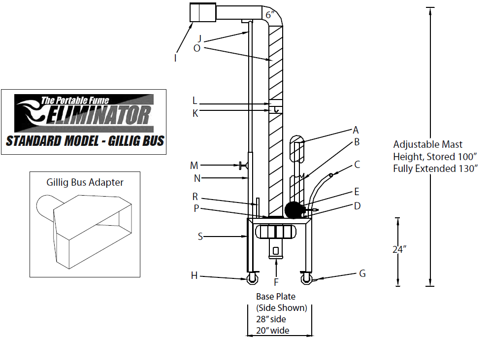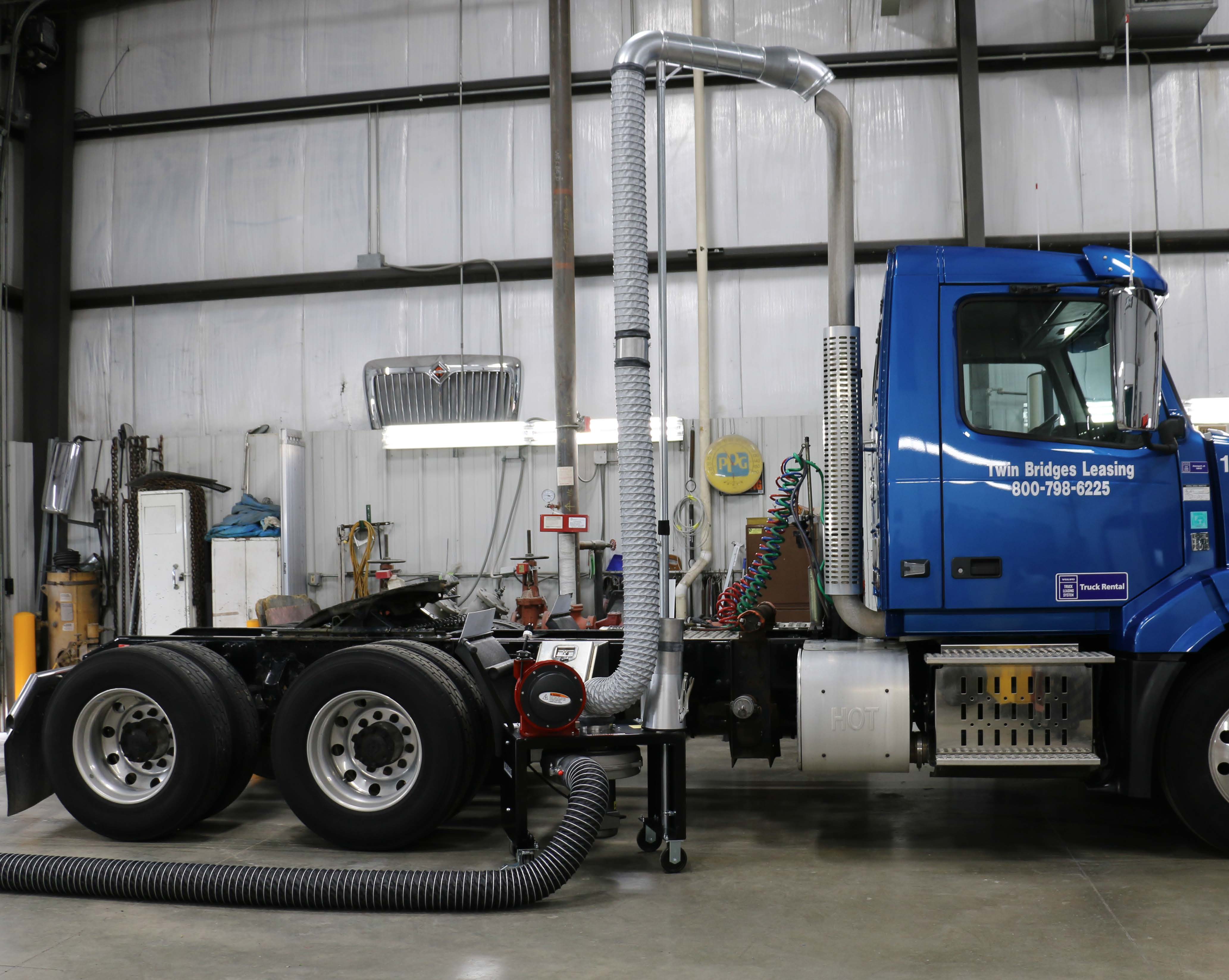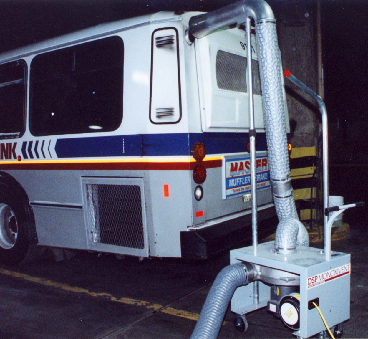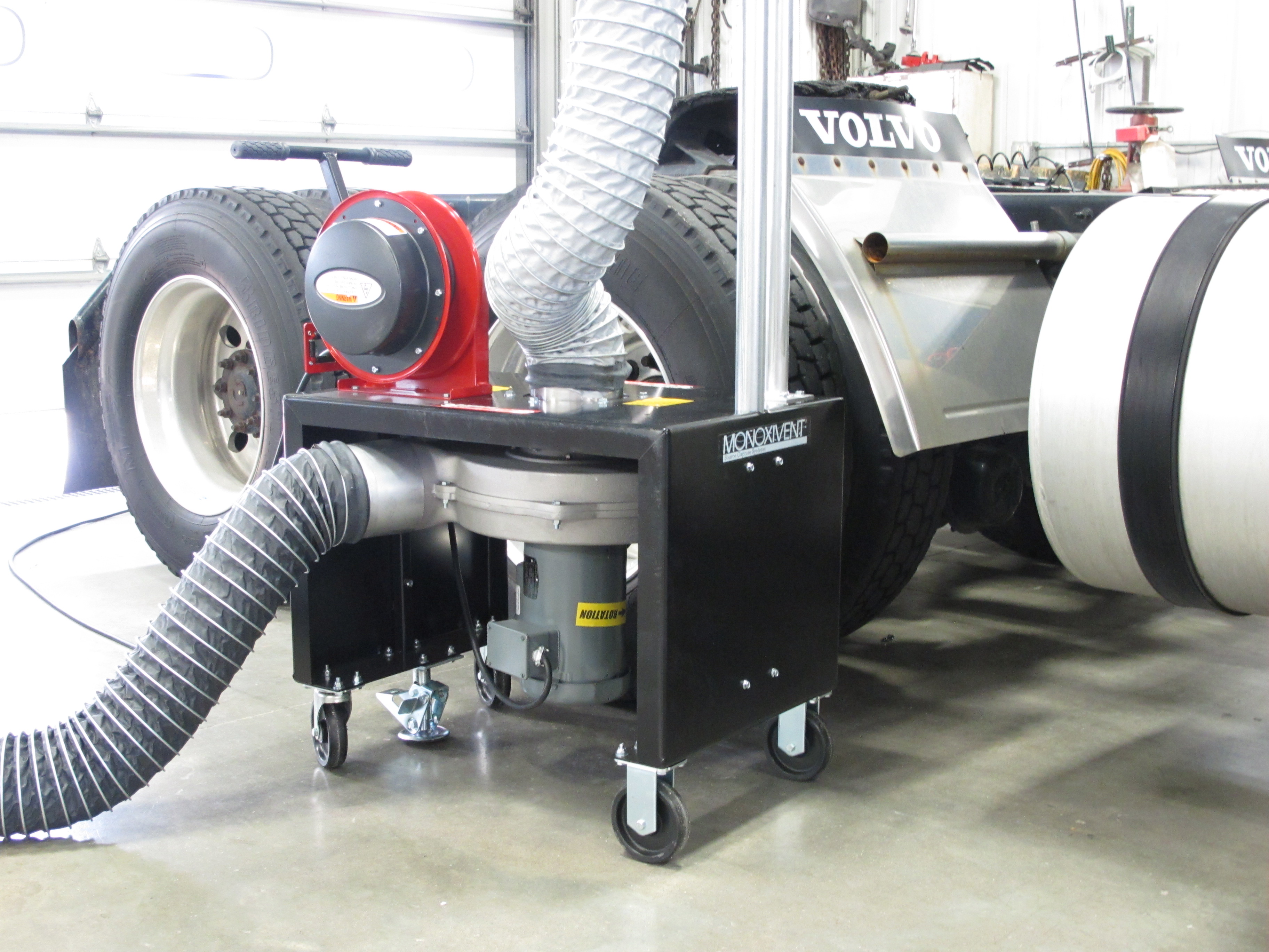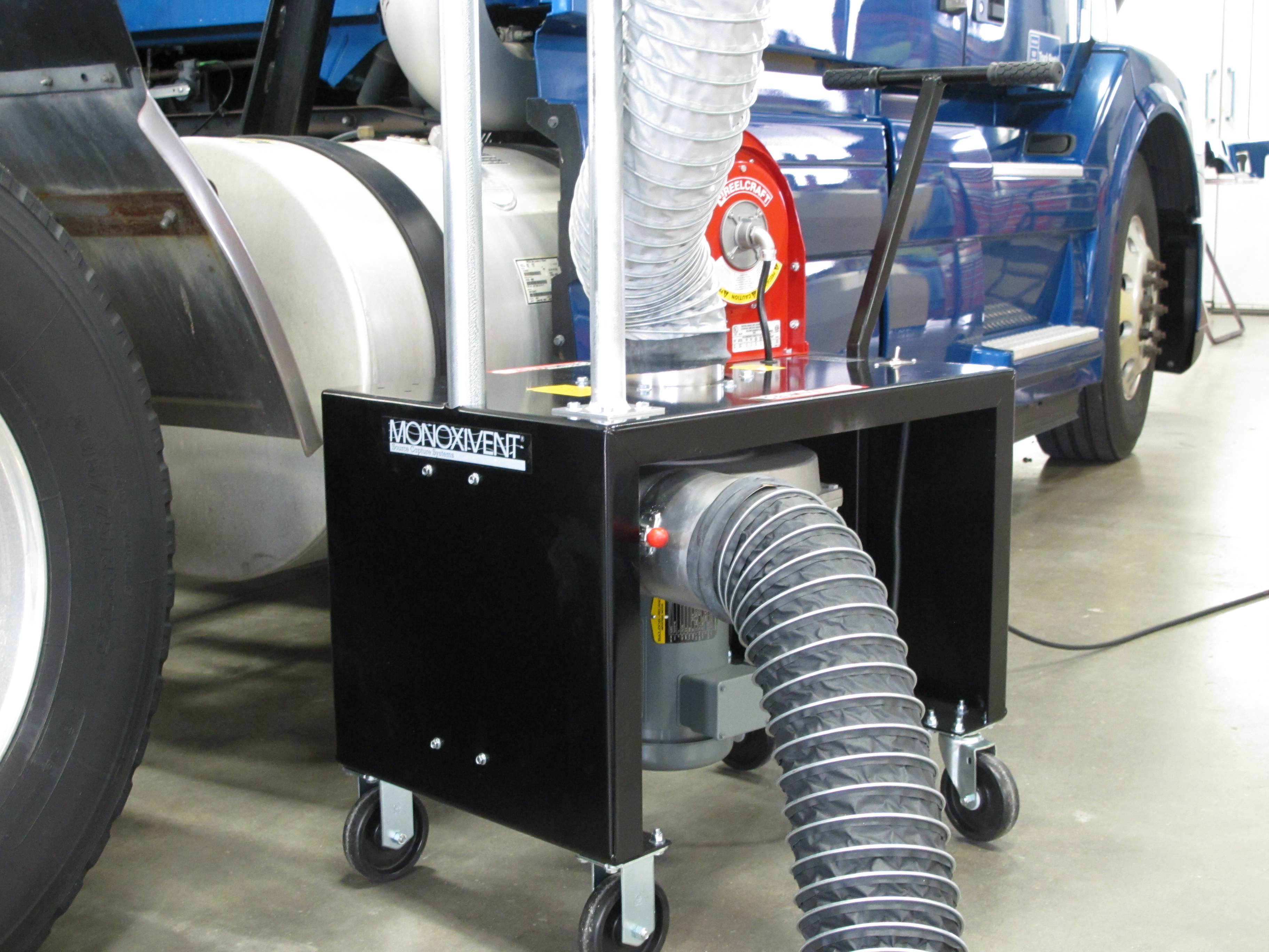 The Portable Fume ELIMINATOR was developed for use in shops where a conventional overhead or under-floor exhaust system is not practical. It is ideal for truck, bus, agricultural and construction equipment applications that require fume extraction.The ELIMINATOR is a compact, self-contained portable exhaust system. The compact base with a footprint of 20” x 28” makes storing the Portable Fume ELIMINATOR easy. Depending on the model, the vertical mast has a stored height of 90” or 120”. The adjustable mast can be easily raised or lowered to fit all top and mid-body exhaust pipes. For under chassis, simply uncouple the hose on the vertical mast and couple it to an under chassis clamping nozzle. For truck applications, the main vertical stack features a 45-degree end with an 8” opening.