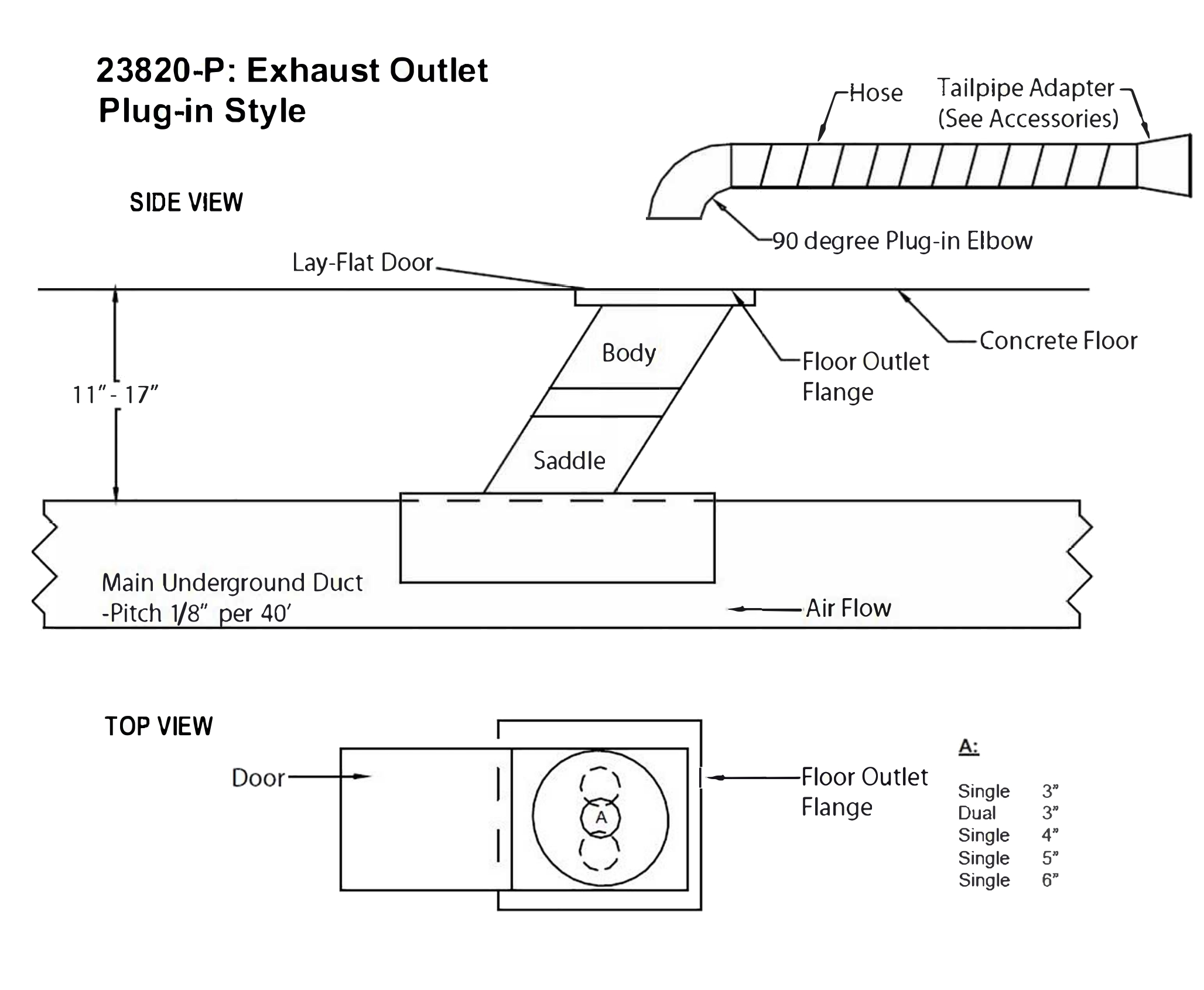 Underground Exhaust Systems are offered as a plug-in configuration with ductwork underground. The plug-in configuration the flex hose simply plugs into the floor outlet; and the flex drops are stored, above ground, on hangers. The system features single or dual outlets. Benefits include: self-contained hose assembly; lay-flat door, flush with shop floor in open position; eliminates need for hose drops from the shop ceiling; 3000 Series Hose features heavy convolutions and is no-crush neoprene type hose. Applications include: auto dealerships, motorcycle shops, light/heavy equipment repair, garage settings, anywhere an overhead system is not practical.